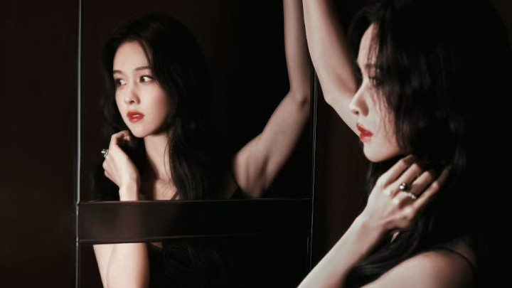 陈齐灵墨发垂落黑裙勾画,红唇慵懒目光疏离,撩东谈主韵味我方品