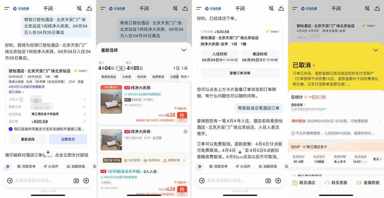 AI对旅游出行行业的转换成普及服务专科度和成果运转。记者了解到,起原千问APP深度接入飞猪。当今,一批新功能正在缓缓灵通测试体验,用户不错通过对话在千问APP内浅薄遴荐旅店房型、一键付款,还能让千问修改照旧生成的订单、维护退订、查询退款过程等。